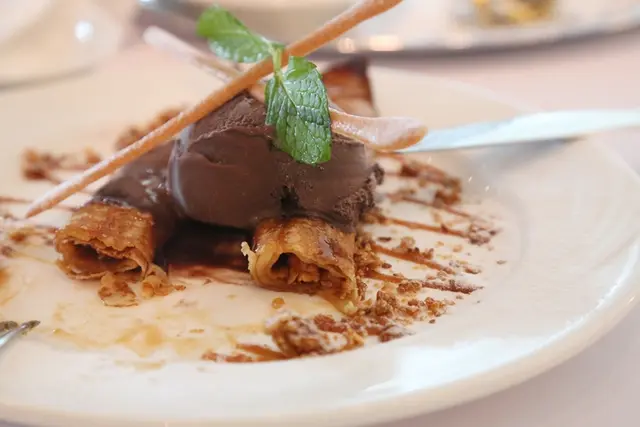 巧克力冰淇淋上的餅乾香香脆脆也好吃,這是一道令人感到幸福的甜點