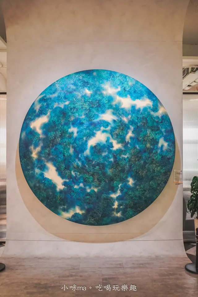 一走進想陽明山就可以感受到濃濃的藝術風格,映入眼簾的是藝術家-吳冠德老師的畫作,老師的創作特色就是以樹枝為畫筆,天地萬物作為靈感,這幅吐納天地更是想陽明山的鎮店之寶, 搭配專業的美術館燈光投射,很多人一進來就會被著這幅旋轉流動的畫作給深深吸引,彷彿可能聆聽到自己的內心