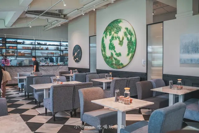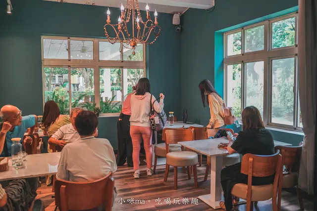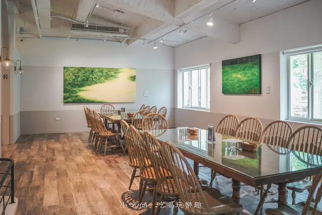 趁客人還沒入座的時候拍一張,這邊是沙發區,牆上也用了吳冠德老師的畫作妝點,感覺就像在藝廊裡面,靠窗的位置也是直接看到外頭的綠意,非常舒服
