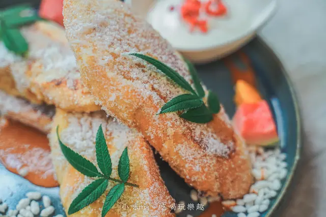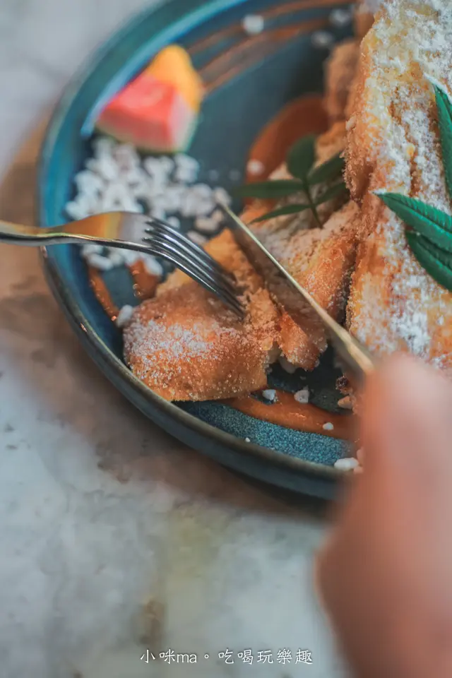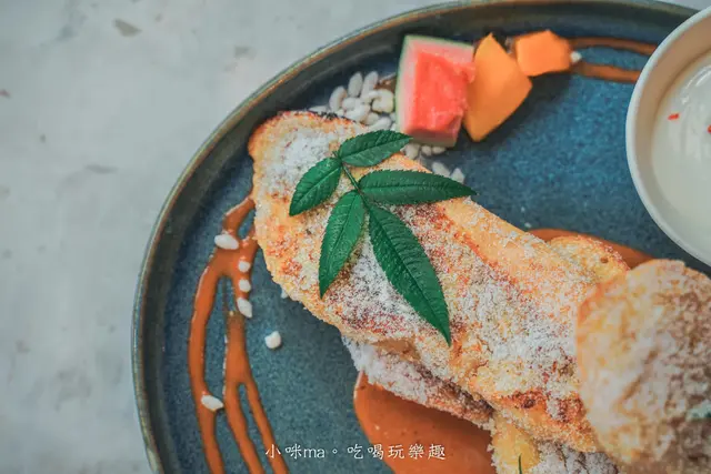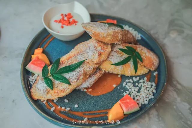 吃完韓式再點個泰式法式吐司,法國麵包吸飽蛋液煎到微微焦香,裹上一層糖粉就是法式吐司給人的幸福滋味,一旁用了泰式奶油醬、新鮮水果、米香點綴,沒想到法式吐司跟甜甜的泰奶醬很搭,顛覆我對法式吐司的感覺