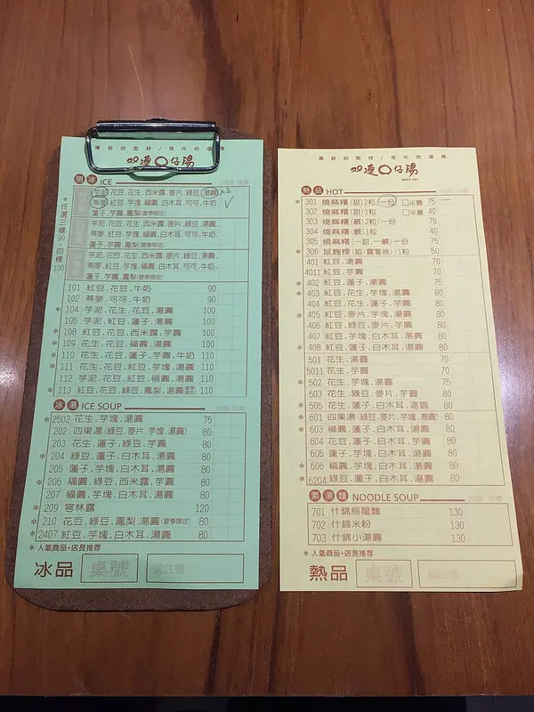 分冰熱品兩張菜單,綠色為冰品/黃色為熱品