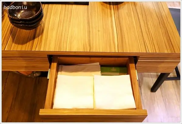 濕紙巾及餐巾紙都在桌子下的抽屜內,收納的很整齊。