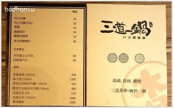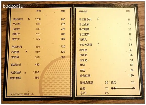 鍋類的菜單在另一面,雖然店外也有擺一份,也知道餐點不便宜,但真正坐在店內看到價位時還是有點倒抽一口氣XD