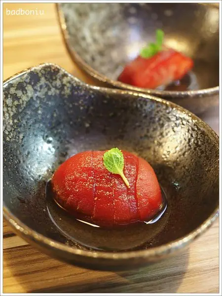 餐點有份單點及套餐價,單點就只有肉品(連菜盤都沒有!),所以建議還是點套餐比較划算。這一道是套餐附的開胃菜—酒釀蕃茄,真的有股淡淡的酒味,但還算好吃。