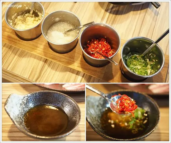 調味料的基底是清爽的水果醬油,不死鹹,小朋友吃起來負單也不會太重。蔥末、蒜末、蘿蔔泥、生辣椒都是新鮮現切;辣椒末很辣,不嗜辣者請小心服用。