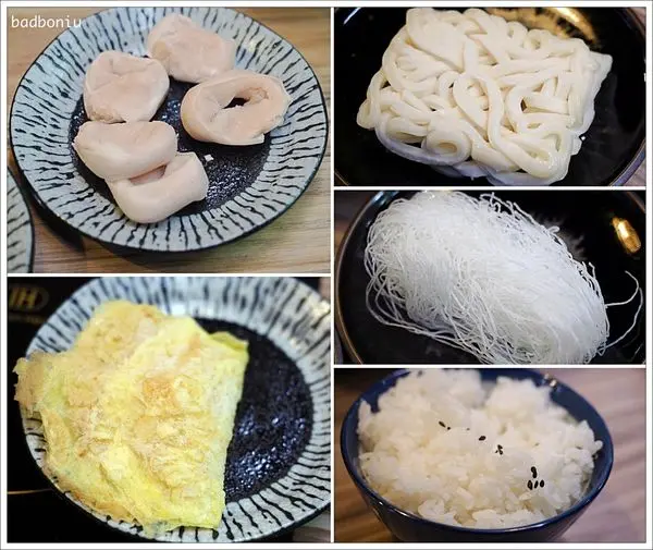左邊是另外加點的魚餃及店員推薦的蛋餃,蛋餃吃起來真的很有蛋的香氣,果然是必點!當然魚餃也不錯囉!套餐都有附白飯、冬粉、寬粉及烏龍麵(加10元),可以依自己喜好做選擇。