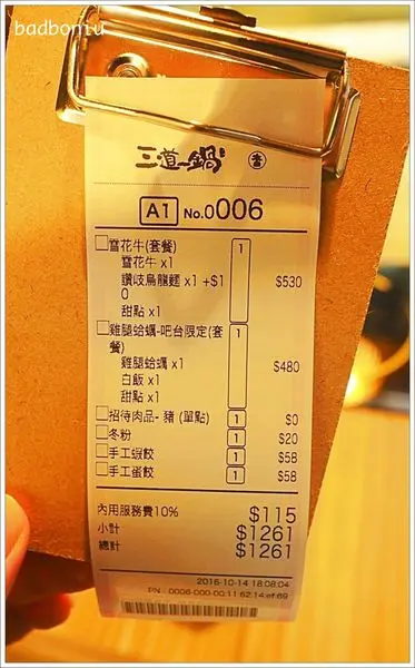 最後的帳單。價位上真的不是很便宜,但是湯頭的清爽甘甜及食材的新鮮,還有整個質感及服務都很不錯;至少咱們家吃完後是心滿意足的離開,價錢就下幾餐再省回來囉 XD