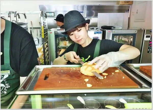 經過15分鐘,菠蘿麵包終於烤好了!出爐後店員熟練地先將熱呼呼的菠蘿麵包切一半。