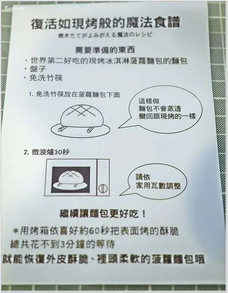 如果是外帶菠蘿麵包回家的話,店員也會附一張魔法食譜,讓你的菠蘿麵包可以跟剛出爐的菠蘿麵包一樣酥脆~