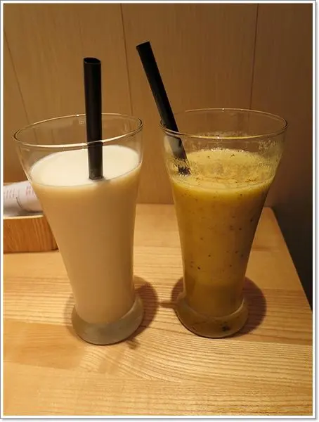 左邊是豆奶,右邊是熱情森巴果汁。豆奶是A餐的飲料,熱情森巴果汁是B餐的飲料,價格也不一樣喔