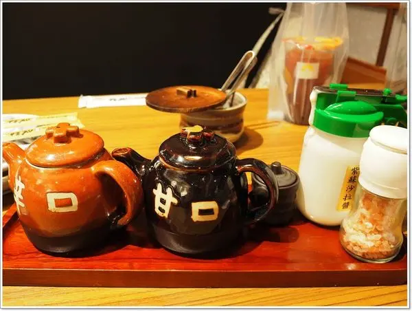 桌上的調味料有幾種,也有玫瑰鹽,就看自己喜歡那一種囉! 沾豬排的辛口甘口醬,與生菜沙拉的沙拉醬