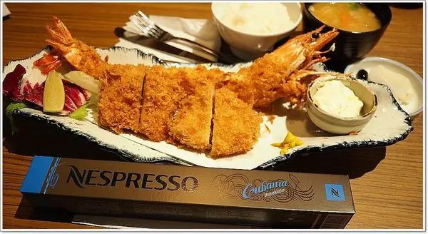 馬上來看這個超過30公分的老虎蝦,有多蝦呢! 比10顆Nespresso膠囊還要長! 跟豬排放一起反而顯得豬排少少的!