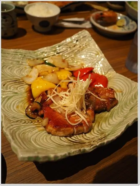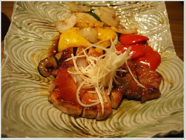 「季節蔬菜香煎厚切里肌豬排」$350,搭配不同顏色的椒(熟的),視覺效果很好! 的確很下飯,而飯也是可以一直續的喔。突然覺得這家店的特色是品名都很長…!