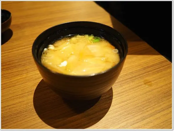 味噌湯。這個味噌湯完全不鹹,甚至有點淡了! 如果日本本店的味噌湯原本就是這個味道,那倒是長見識了,原以為日本的味噌湯只有「鹹」跟「很鹹」兩種。不過三重縣靠海,討海人不是都吃很重口味嗎?