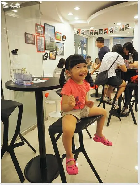 小孩子雖然不適合坐這個高腳椅,但這個位置卻是觀看KUMAMON影片的最佳位置,瞧波妞看得多開心!