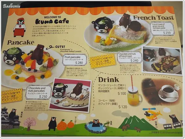因為低消是每人一杯飲品,所以本來想選兩樣餐的,就變成只好選一樣。這是KUMAMON的PANCAKE,剛上桌時感覺有點弱掉的感覺XD