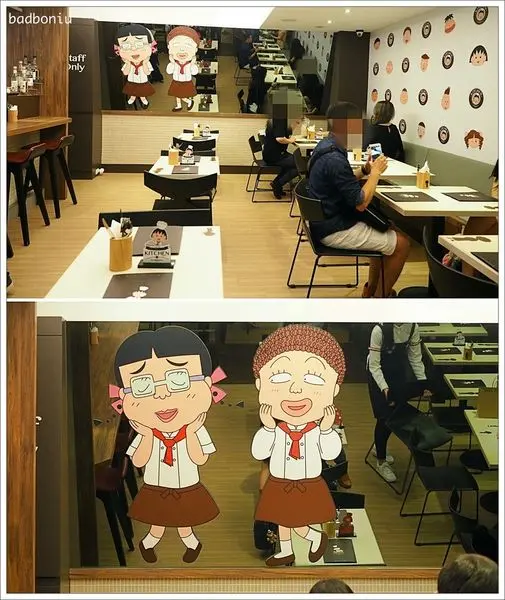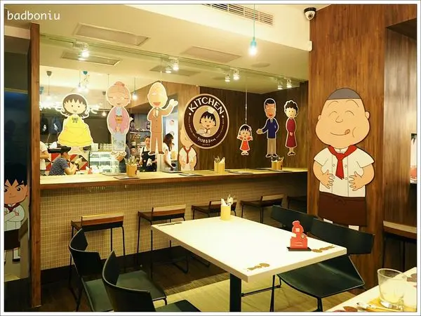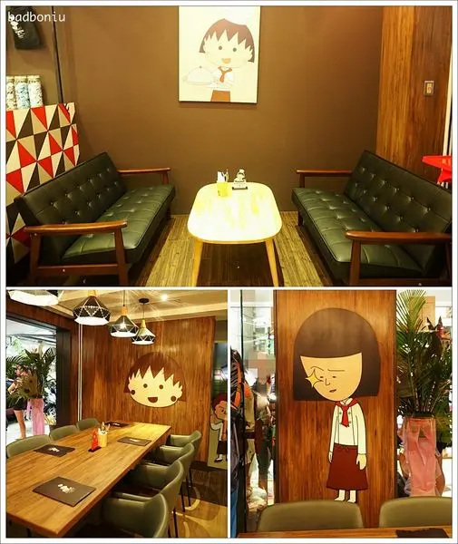 一樓的用餐環境明顯比較舒適,空間比較大,也有更多的小丸子與同班同學,相信小丸子迷應該每個都叫得出名字喔。左邊是迷蠻花輪的美環,有點像我們熟知的石榴姊。右邊是常常在背後突然出現冷笑的野口笑子。