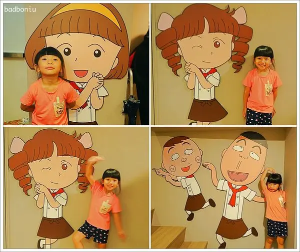 雖然提早到了,但顯然還沒辦法入座,大家就開始跟門口的小丸子公仔合照。這個小丸子底下有輪子,所以要小心不要把她推去大馬路喔