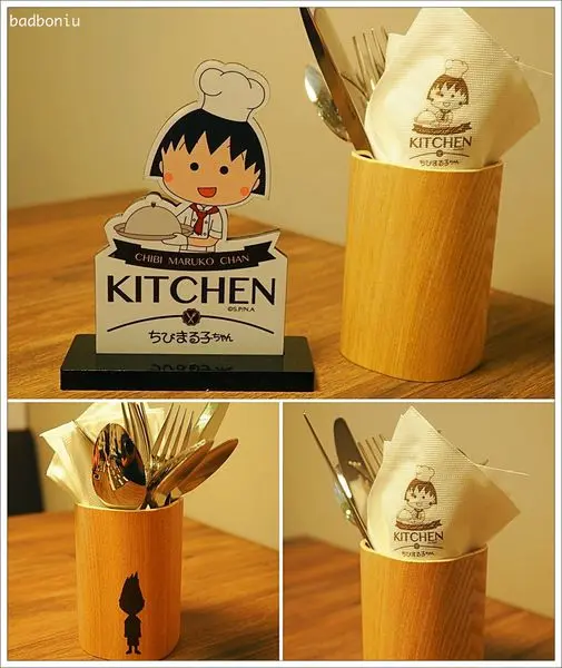 桌上有可愛的小丸子立牌,與裝刀叉的容器。每個座位有不同的小影子,看得出來是我們這桌是誰嗎。