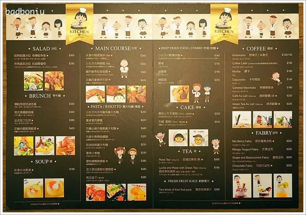 餐點有二百多也有三百多的,很多以角色名字命名。每個人的低消是一杯飲料,其實覺得有點困擾,因為我們已經點餐了,還是得再點飲料滿足低消。
