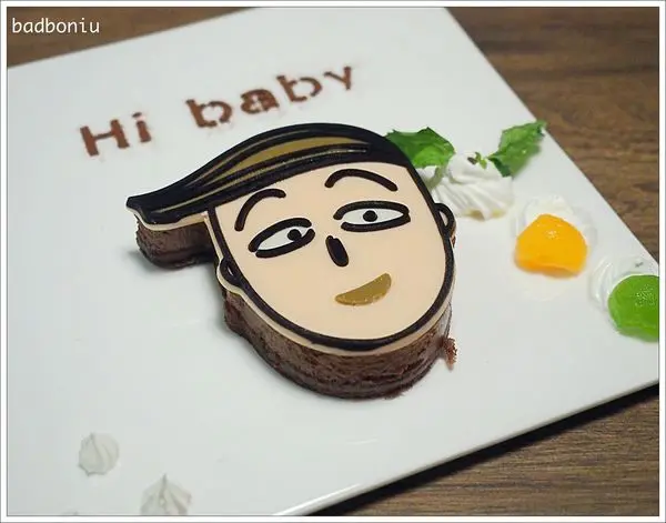 「花輪 和彥」蛋糕,只催了二次就來了。看到「Hi Baby」大家應該都會會心一笑吧,呵~,擺盤還算精緻,算是可以解釋要等這麼久的原因。