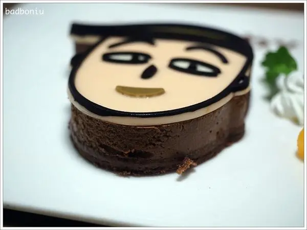 上面的花輪是白巧克力,蠻甜的。底下是巧克力蛋糕,外層的巧克力泥比較甜,裡面的巧克力蛋糕就比較「生」一些! 但這個蛋糕對愛吃甜巧克力的人來說應該會覺得很不錯。