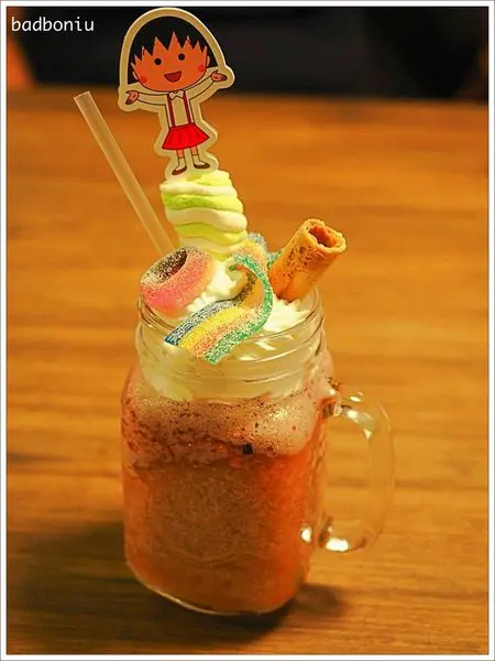 「綜合莓果法布」,壓軸的飲料當然要千呼萬喚才會上來囉! 上面小丸子造型的攪拌棒插著壞波妞愛吃的棉花糖,另外像蜜餞呈條狀的,酸的非常非常的夠味,不是每個人都能挑戰的酸喔! 底下就是奶油跟莓沙冰沙,也是甜味較多。不過飲料跟餐點比起來算成功許多唷!