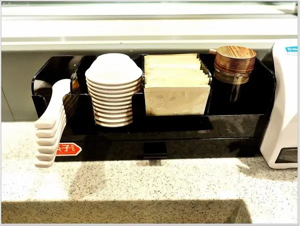 跟爭鮮一樣,茶包、筷子、湯匙、小碟子都在軌道旁自取,熱水出來的水龍頭也跟爭鮮如出一轍;這裡用餐不收茶資,但一成服務費還是要滴~