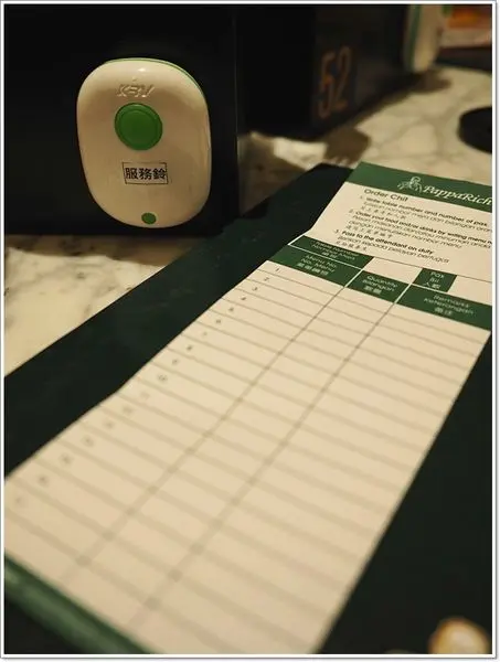 點餐是自己在單子上寫上餐點的編號,旁邊的備註欄可以備註要小辣、中辣或大辣。寫好之後再按桌上的服務鈴,服務生就會過來幫你確認餐點了。