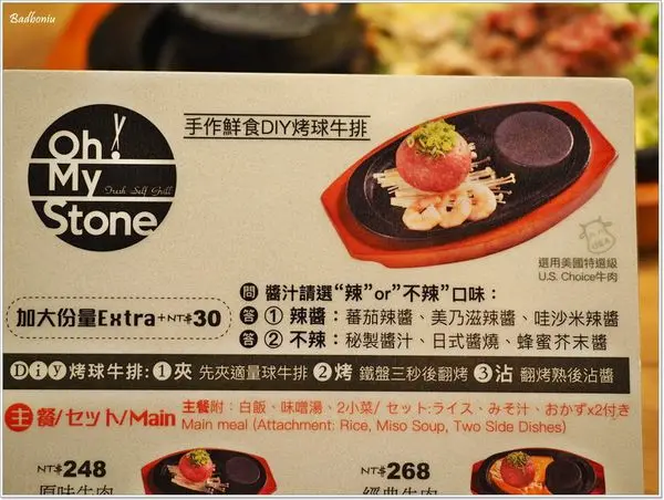 最近FB洗版的新開夯店莫過於這家源自福岡、卻在韓國發揚光大的「Oh!My Stone 球牛排」了! 不過因為暫不接受電話訂位,又實在很想吃,只好厚臉皮的亮出「壞波妞」名號問店家能不能開幕前一天先讓我們嚐鮮? 其實亮出名號這招對我們這種小咖大部份時間不太管用,但這次竟然成功了,所以我們終於也能搶先吃到傳說中自己DIY的美味漢堡排囉~~