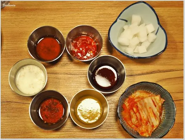 點好餐好,店員會送上小菜漬物及沾醬上桌。泡菜及醃蘿蔔很入味,都很好吃。沾醬一個人可以選3種,我們兩個人正好可以每種醬都來一個!