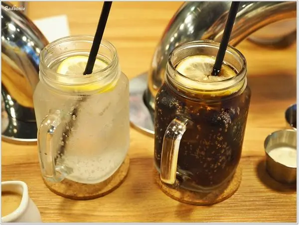 套餐的飲料,主要是以$40元的飲料為主,但也可以補差價點其他的飲料。本以為飲料會是一瓶或一罐的,頂多再送上玻璃杯讓客人自己倒,沒想到居然是裝在造型杯子內,還有檸檬片呢!