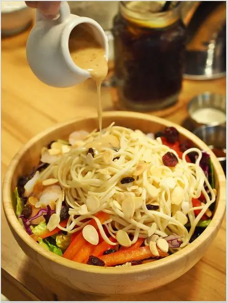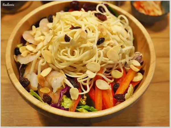 再來送上桌的是"義大利麵"沙拉,看起來好大一盆!但麵的份量倒不會太多,因為底下滿滿的都是生菜,還有幾尾蝦仁!所以讓你吃肉也有吃夠蔬菜的纖維質。
