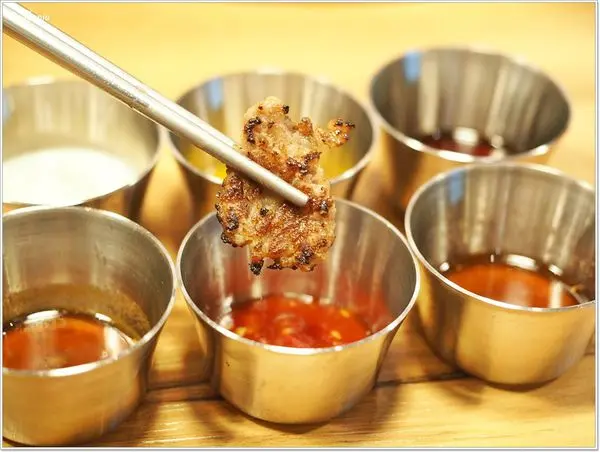 煎好之後,計能選擇自己喜歡的沾醬開始享用啦!每一種沾醬都各有特色、也都很好吃,而且就算標示有辣的吃起來也不是太辣,所以可以跟同伴一起把所有的沾醬都點來試試看。