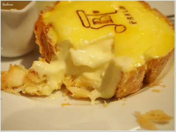 因為是熱的,所以裡面的起司是軟軟、熱熱、會流動的,甚至還會有點燙口!起司香氣超濃郁!旁邊的酥皮也因為剛出爐,吃起來酥酥片片,雖然很有蛋塔的感覺,但跟蛋塔又是不同味道。