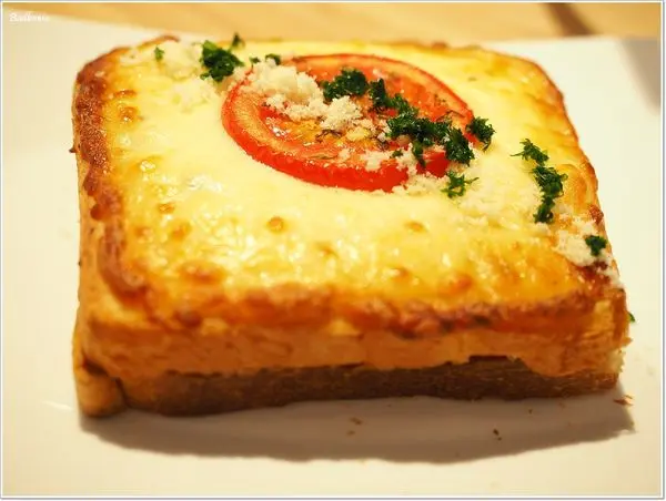 因為中午時間,怕波妞想吃鹹的,所以另外點了一份庫克熱三明治。可以看到表面滿滿的起司,所以起司香起超重,很有土司版PIZZA的感覺。