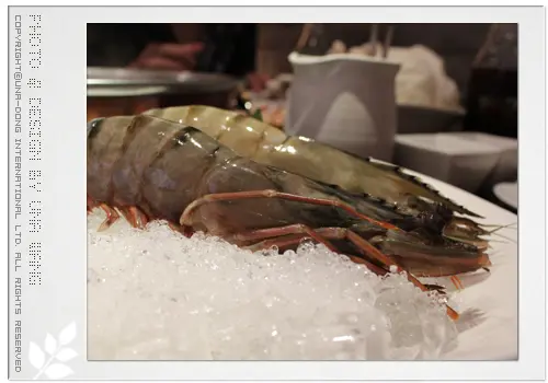 只是我們一直擱在一旁遲遲不下鍋,因為一丟下去應該會被蝦頭給染色,所以先暫緩在一旁,等肉類吃的差不多再來好好品嚐,底下佈滿了碎冰塊,好保持海鮮的溫度,貼心~