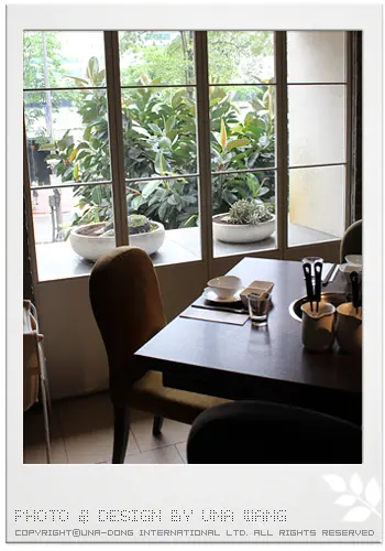 吃到一半開四處參觀,幫助消化一下;帶著我的寶貝600D開始紀錄環境,我們屬於室內位,照不到陽光但光線仍充足,一旁還有高雅的布幕燈壟罩,座位旁還有置物袋,提供客人放包包不佔位