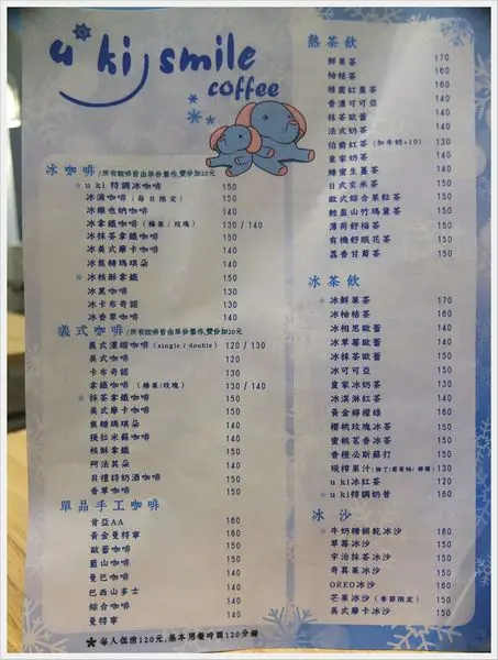 恩!這是菜單,有低消120元,用餐限時2小時(如果人不多應該不會趕你)