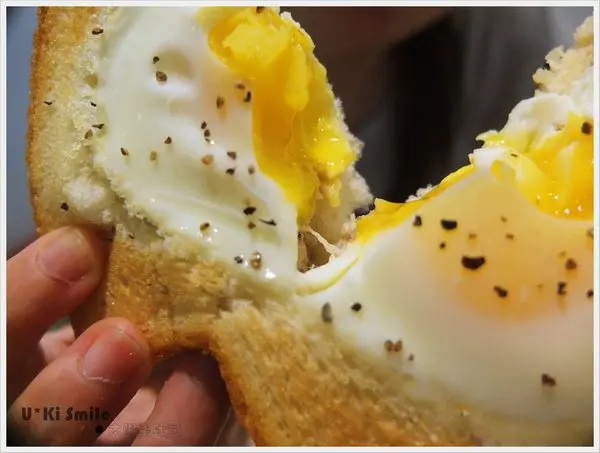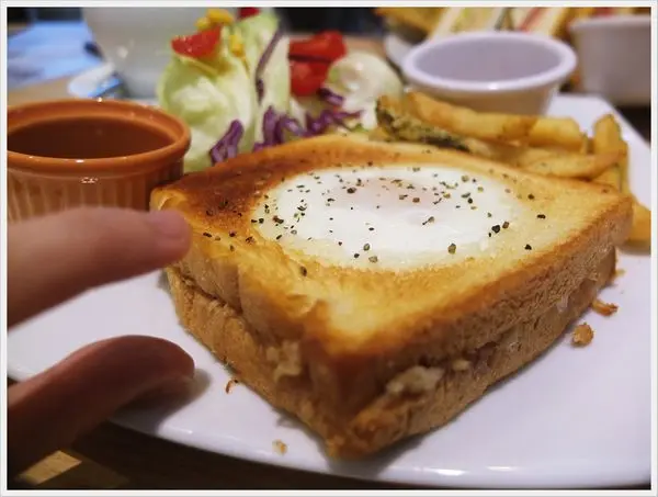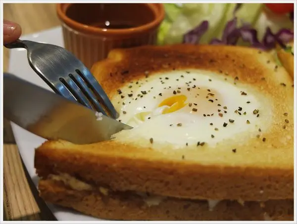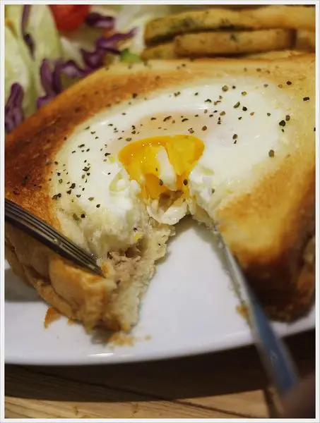 蛋黃是整個深陷在兩片吐司中當黏著劑,已經很熟的蛋白白呼呼,