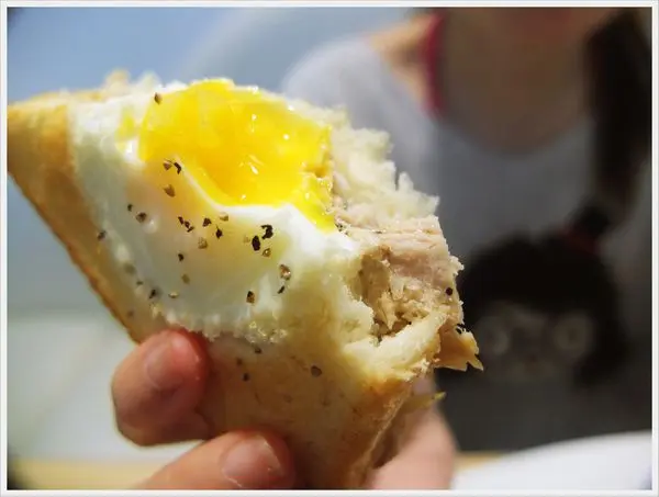 而鮪魚則藏在吐司裡面,可以從側面的吐司中看到跑出一點點,