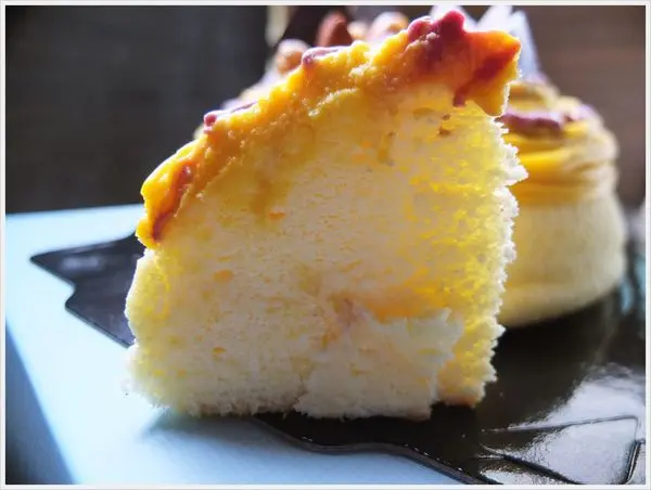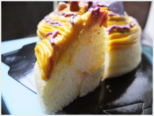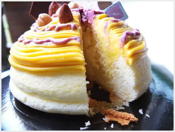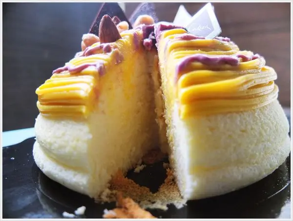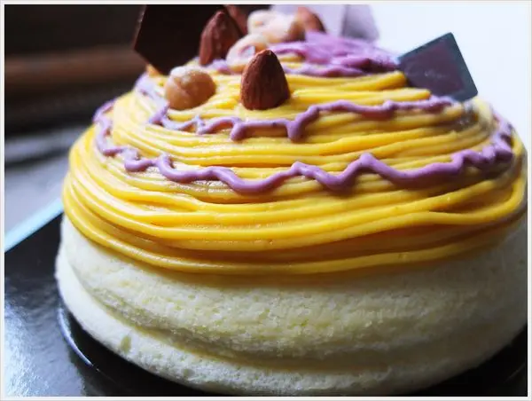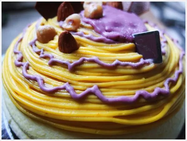 翡冷翠圓帽南瓜起士蛋糕外型相當華麗,漂亮的黃色、紫色相兼