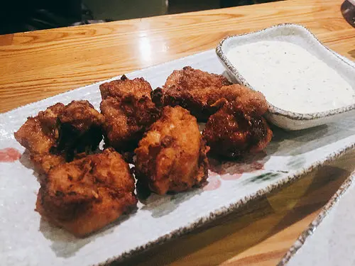 就炸雞塊啦!選擇的沾醬是塔塔醬較解膩,雞腿肉鮮嫩,外表炸的剛好,不管單吃或沾醬都很棒,一口咬下肉汁就爆出來了!另外也有椒麻可以選擇。