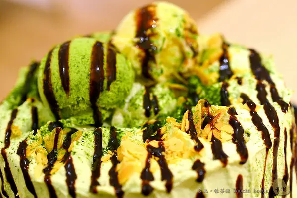 這個蛋糕份量也還不小,蛋糕體外圍滿是抹茶味奶油及巧克力醬,上頭再撒上堅果並放上兩球冰淇淋。