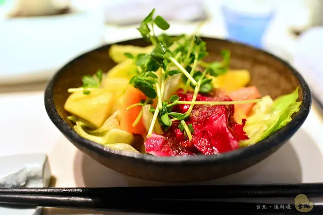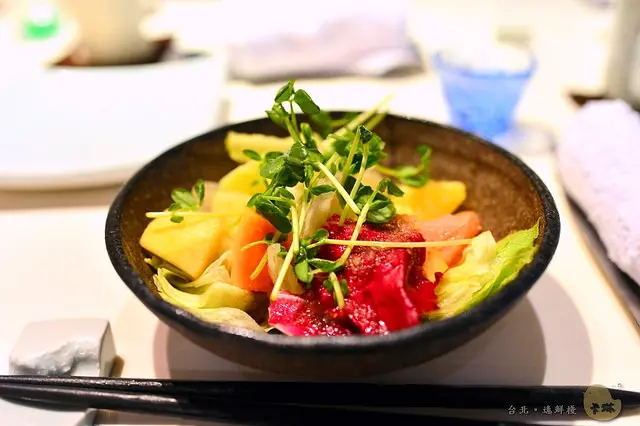 充滿水果的和風蔬果沙拉,醬汁雖然看起來不多,但也夠沾附每片菜葉了。