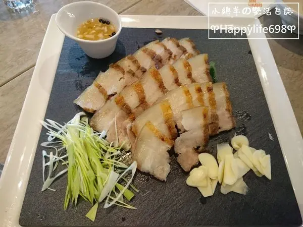 品嘗時,可以將蒜片和蒜苗捲在肉片中,再沾一點醋(有加入馬告)來去油提味。