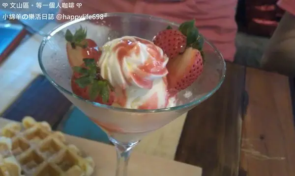 一旁的高腳杯盛裝一球香草冰淇淋、卡士達和四片草莓,覺得分量稍微少了一些,應該可以