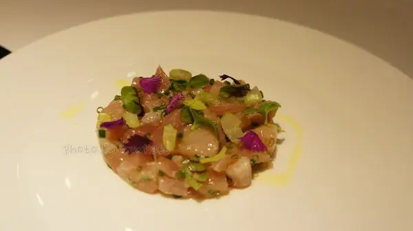 前菜:柚香青魽。青魽切丁加入柚子汁之類,因為是友人的前菜,僅淺嚐一小口。味道出乎我意料地優雅,而且擺盤很美,如果敢吃魚生的人,十分推薦這道前菜。