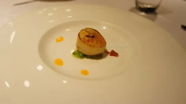 前菜:香煎干貝。干貝好吃但就這麼一個孤零零地上桌,有點淒清!干貝底下的青豆仁外表看似樸實無華卻很美味,千萬不要漏掉它。