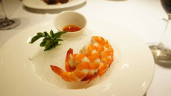 前菜:雞尾酒蝦。我就是想吃蝦又貪圖這道菜不用剝殼~一份前菜共有5隻蝦,蝦的個頭頗大、蝦肉飽滿,腸泥去除得非常徹底。比較可惜的是蝦肉沒什麼甜味,一旁的雞尾酒醬番茄醬感較為強烈,不是我喜歡的味道。